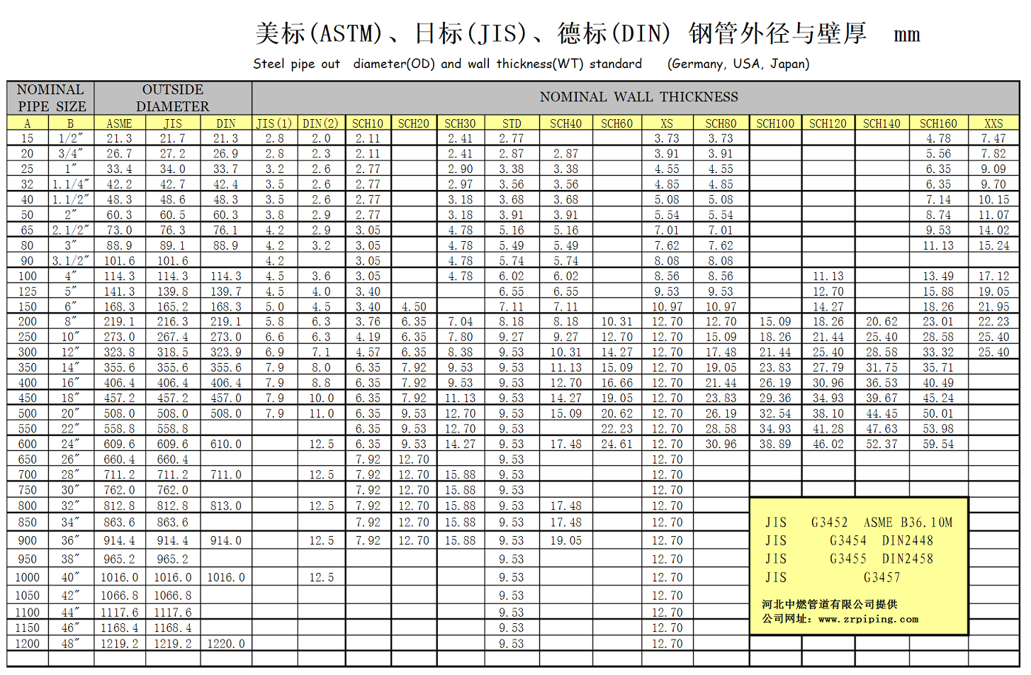 美标(ASTM) 日标(JIS) 德标(DIN) 钢管外径 壁厚