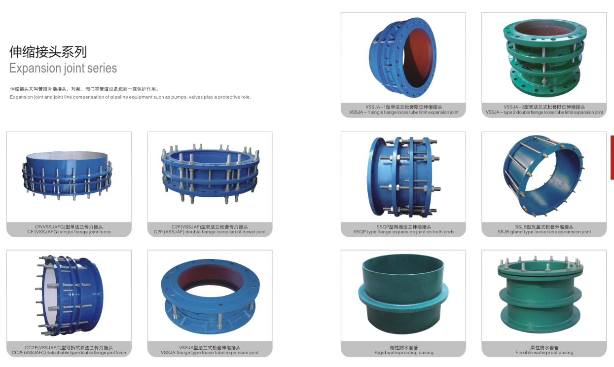 AY型压盖式伸缩接头,AF型法兰式松套伸缩接头,BF型单法兰限位伸缩接头,B2F型双法兰限位伸缩接头,BY型压盖松套限位伸缩接头,CF单法兰传力接头,C2F双法兰传力接头等。