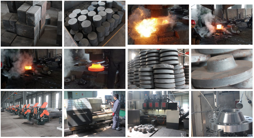 总则: 带颈对焊法兰参照相应标准及用户技术要求结合我公司具体制造设备、检测设备等情况而制订。 1、材料 1.1材料选用 a、法兰用母管材料力学性能及化学成分符合相应标准要求的锻制坯料或相应板材标准的有关要求。 b、碳当量Ceq:材料碳当量值要适宜,碳当量过大影响材料的焊接性能,碳当量偏低会影响钢管在加热的淬透性,淬火组织强度低。 c、选用材料的表面,应无油脂、过多的锈、焊剂和腐蚀物、低熔点金属污染、管体表面明显凹痕缺陷,注意焊缝修补处的表面、管端口尺寸等。 d、材料标志清楚、完整,符合相关标准中有关条款的技术要求。 1.2材料的选择 法兰材料的坯料选择要根据法兰成型后的实际情况和锻造比选择不同规格的锻坯,根据重量不变的原理进行坯料的计算。并下发工艺卡。 1.3材料的检验 a、进厂检验前材料表面用钢丝刷轮角磨机,进行机械除锈。 b、表面尺寸检验、除锈后的材料进行表面及尺寸检查。 c、材料按炉号进行材质分析或光谱分析,确定元素含量及性能测试。 1.4 材料的追溯标识清楚,在制造过程中,原材料的炉号、批号、长度以及卷成直缝管后材料的编号,所用材料长度,所用材料的部位等,对材料的移植应有追溯性记录。 2、产品加工过程 2.1材料按用户的规格尺寸对于不锈钢材料的下料最宜采用龙门带锯床进行冷切割下料,不宜用等离子等热切割的方法断料,以保证减少材料的浪费并避免造成断口处或热影响区金相组织发生变化;防止材料在切割过程出现淬硬层或因操作不当造成裂纹等缺陷。切割后用砂轮磨光机对端口处进行打磨,去除端口毛刺及棱角。碳钢材料采用氧--乙炔火焰或锯床下料,在下料过程中要求按材料的规格和材质等不同进行必要的标识移植并且对断好的坯料的几何尺寸进行逐件检验。 2.2法兰坯料锻制。法兰按相应材料的锻造工艺要求将合格坯料放在加热炉中加热后进行锻造,大型管件的坯料要在夹板锤下进行自由锻造。所有法兰坯料均需达到II级锻件以上要求。不同材质的坯料按相应加热温度和保温时间的工艺卡要求进行。 2.3管件毛坯(法兰坯料)热处理,按不同材料的热处理工艺对经热(冷)加工成型的管件及锻造完成的法兰坯料进行热处理,以达到消除应力、细化组织、提高材料的强度、韧性等综合性能。热处理工艺按热处理工艺卡执行。热处理的工艺步骤按以下要求: 2.3.1检查热处理炉各部件:火嘴、温度计、风机、油泵系统、台车装置、炉门升降装置等应处于正常备用状态,油库燃料量应满足热处理使用。 2.3.2装炉:(1)工件要垫高400mm左右,排列不应使工件互相受压,间隔150mm防止变形便于冷却均匀散热。根据形状合理进行布局,并绘布置尺寸草图,同时编写号码做好记录。(2)法兰应在台车上垫平,防止弯管受热后产生变形。(3)调整挡火墙,使火焰不直接喷射到工件上。 2.3.3点火前查看炉膛砂封是否良好,如有缝隙应用耐火土或硅酸铝高温石棉加以密封。 2.3.4热处理炉如为冷炉点火时,宜采用半数火咀(即每间隔一个火咀点燃一个,如为炉点火可将全部火咀点燃,注意升温速度恒温时间冷却方式等应符合热处理工艺。 2.3.5调节烟道阀门和油嘴给油量及风量,使热处理炉温度均匀,各热电偶温度均衡,操作人员每间隔15分钟记录一次炉温。 2.3.6.操作人员应经常巡视,检查油炉运行情况,利用观察孔观察炉膛燃烧情况,燃烧不好时及时对火咀风量和油量进行调整,如发现炉膛温度指示有疑问时应用光学高温计进行比较,查出原因进行处理。 2.3.7工件出炉前关闭所有油嘴和风门,填写好《热处理工艺参数记录》。 2.3.8热处理的正火和回火可以分两次进行,如一次连续进行时,正火完后弯管温度必须降至300℃以下才可进行回火工作。 2.3.9同一炉必须只装同一种材质、或相应规格的法兰。 2.3.10相检验每炉不得少于一只;硬度检验每炉不得少于两件,每件不得少于3个点,检测部分分别位于受拉侧的母材,最大变形区。 2.4机加工成型,根据不同管件的规格、型号等要求,按相应的标准要求利用车床、钻床等机械对坯料进行机加工成型,使管件产品达到标准要求的外观和几何尺寸规定范围。检测部门对产品按标准的几何尺寸和型位公差要求进行检验。不锈钢管件在机加工完成后进行酸洗钝化处理,必要时要进行晶间腐蚀检测。 3、检验和试验(型式试验非本公司承做) 3.1表面质量 3.1.1法兰表面不得有裂纹、过烧过热等存在,表面应无硬点。 3.1.2法兰内外表面应光滑、无有损强度及外观的缺欠,如结疤、划痕、重皮等,检查发现的缺欠应修磨清除,修磨处应圆滑直至用着色或磁粉探伤确认缺欠消除为止,修磨后的厚度应符合规定要求。 3.1.3法兰端体上深度超过3.15mm的凹坑,焊缝上深度超过1.5mm的凹坑不允许采用锤击方法修整。 3.1.4缺陷的修补 管体上深度小于公称壁厚5%的尖缺口凿痕及划痕应圆滑修磨,平滑 孤立的圆底痕迹不必修磨. 3.1.5法兰上的任何裂纹、过烧、过热或硬点不允许修补法兰管体的缺陷不允许焊接修补. 3.2几何尺寸检验按照相应标准尺寸要求进行. 3.3.热压法兰的无损检测 3.3.1法兰的无损检测应在法兰热处理后进行,常用磁粉、超声波、射线、着色检测方法,且制定无损检测操作规程。 3.3.2用于磁粉检测的设备,应垂直于焊缝横向产生磁场,其强度足以显示出钢管表面的开焊、部分熔或不完全熔